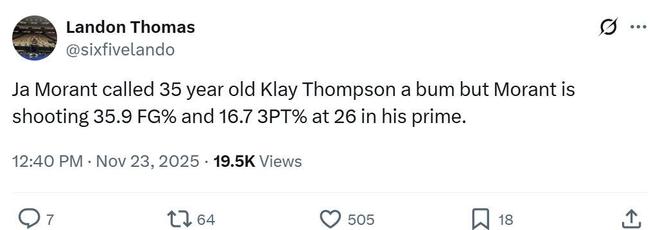 獨(dú)行俠記者Landon Thomas賽后補(bǔ)刀到:“莫蘭特說(shuō)35歲的克萊是廢物,然而26歲正值巔峰的自己本賽季投籃命中率35.9%,三分命中率16.7%。”